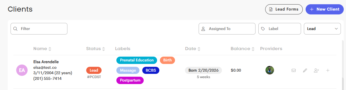 Each time a lead form is submitted, a new client profile is created within Doulado in a Lead status.