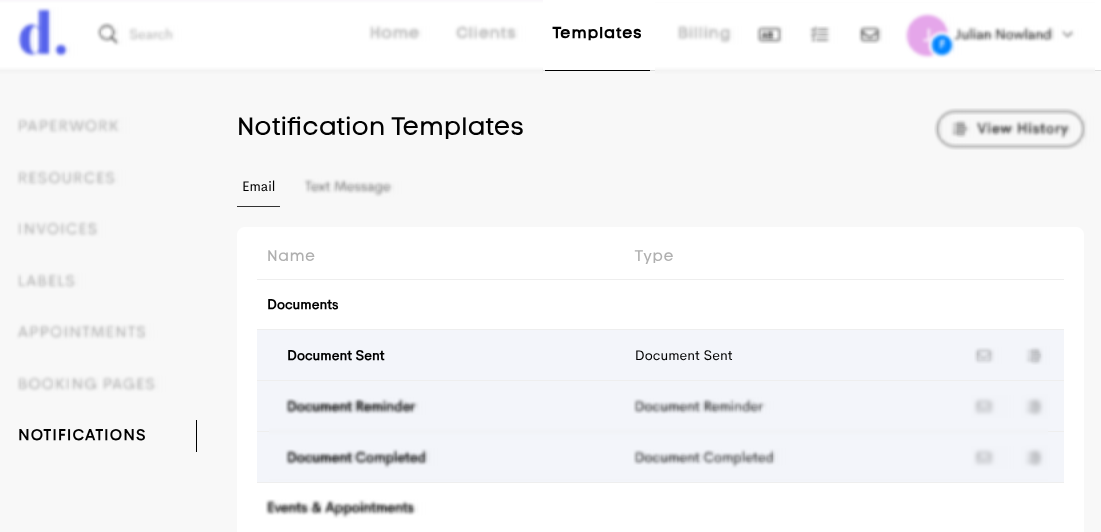 - You can view the history of the each notification type by clicking on the history button to the right of the template