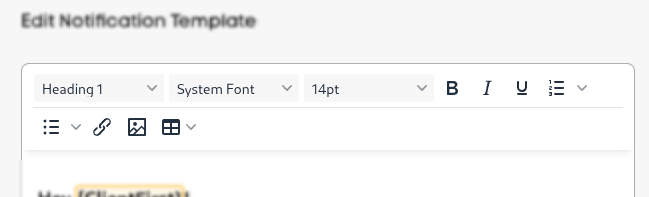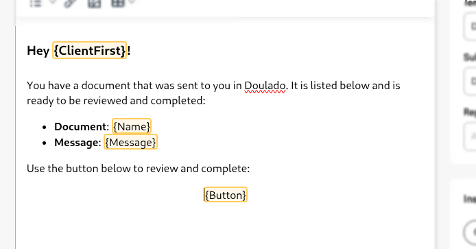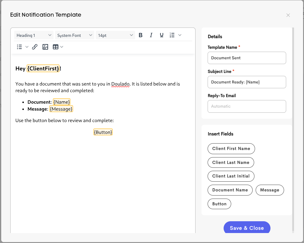 - Insert a field variable to dynamically populate data specific to the client, notification type, document, etc.