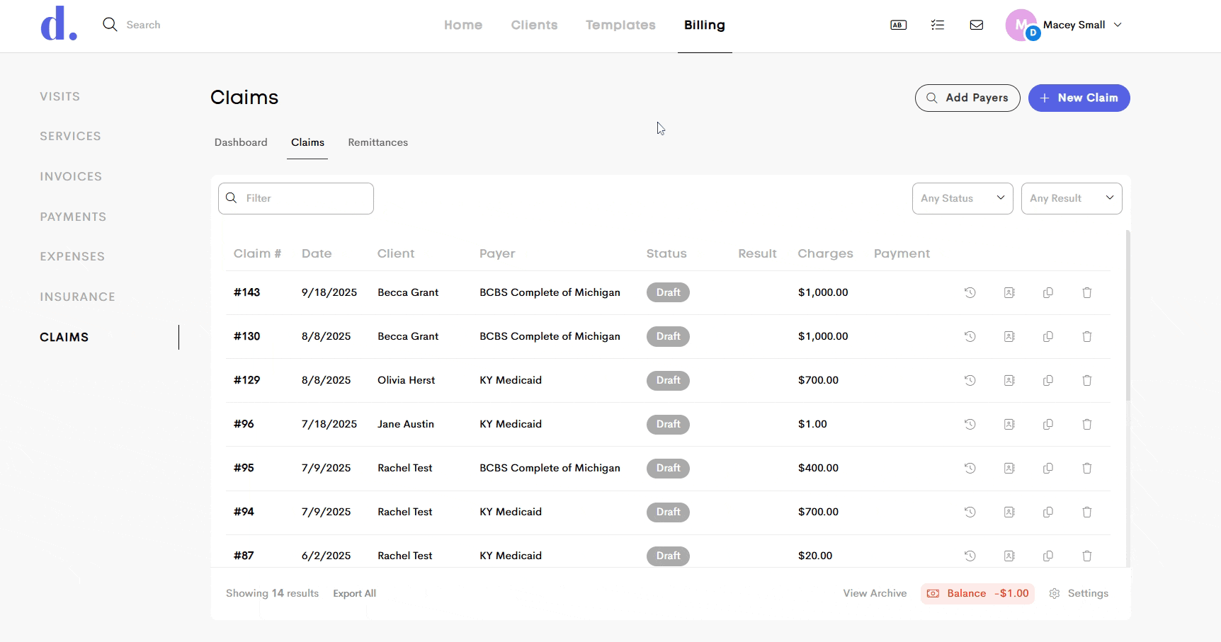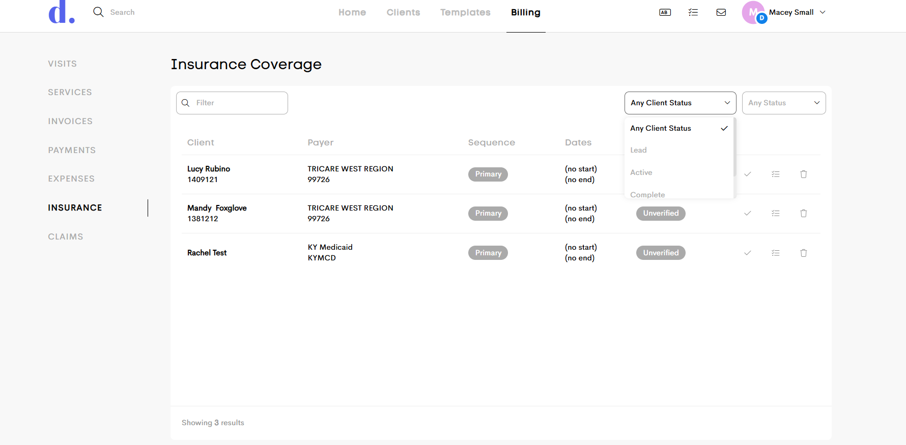- Client Status Filter on Insurance: A new filter has been added to the Insurance page in the Billing section. Along with status and searching for a name, you can now filter by client status.