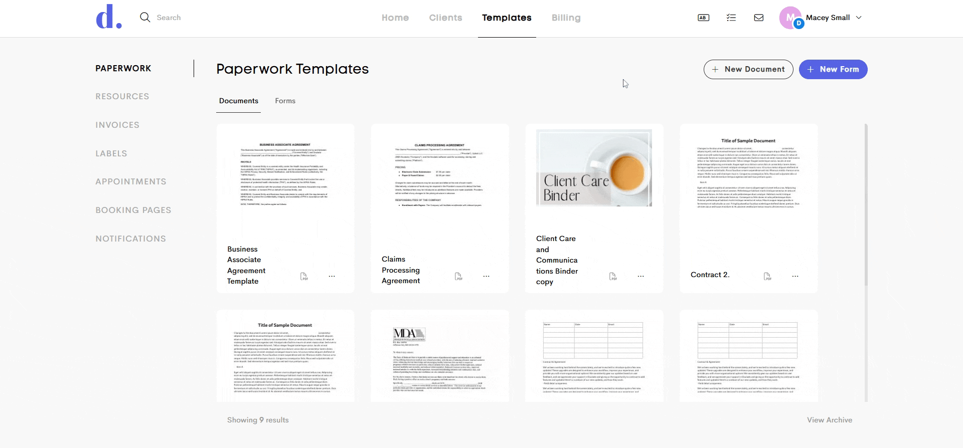 - Document & Form Labels: We have implemented a labeling system for documents that can organize forms into categories. You can click on the small 3 dot menu in the document or form tile, and select "label" to add 1 or more labels to the template. You can use these labels to categorize and filter documents when searching through the Documents and Forms in your Paperwork templates.