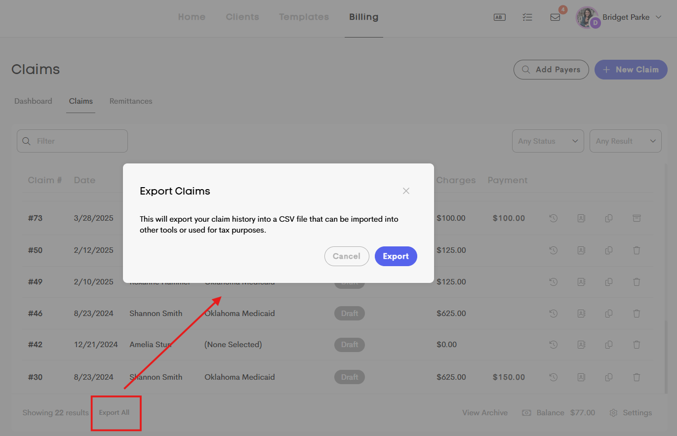 - You’ll also see up to 10 other claims from that account to choose from (both for that client or other clients).