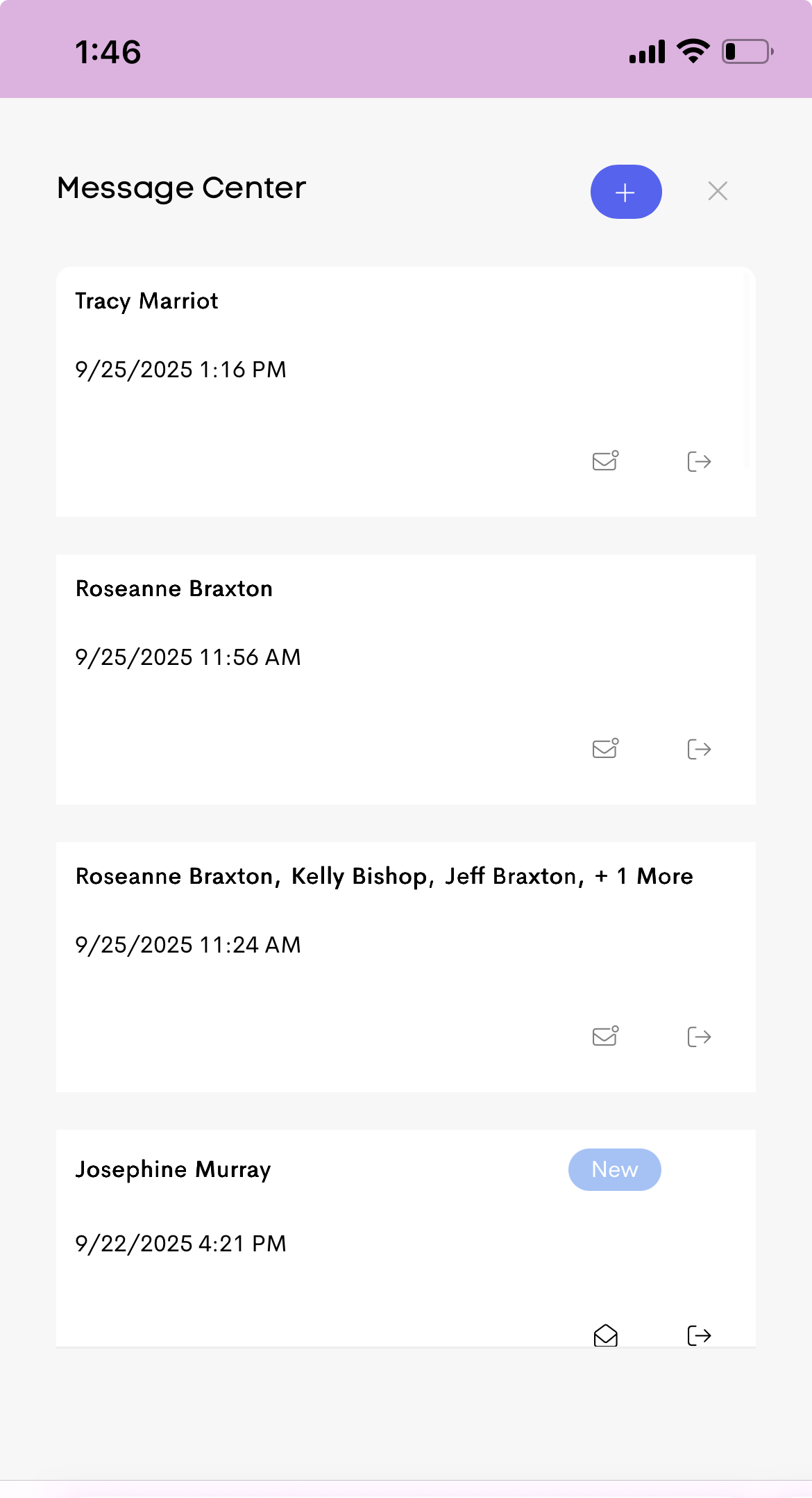 - Linking Recipients: When sending a new message or adding to an existing thread, you can now easily add linked recipients, like a partner, spouse or additional contact linked to that client's profile. When selecting the Add Recipient button, a larger menu will appear where you can search for both clients and providers in their respective menus. There is an Add button available to add one or more clients and/or providers at the same time. When all of the desired recipients have been added, you can close out of that box and type your message!