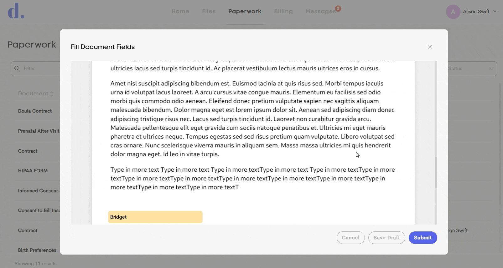 - Error Message Now Shown: Previously, when submitting paperwork with required fields left blank, Doulado did not automatically scroll to the missing fields. This sometimes made it difficult for clients to locate and correct the issue. With our recent update, the form now automatically scrolls to any unanswered field, ensuring the error message is immediately visible.