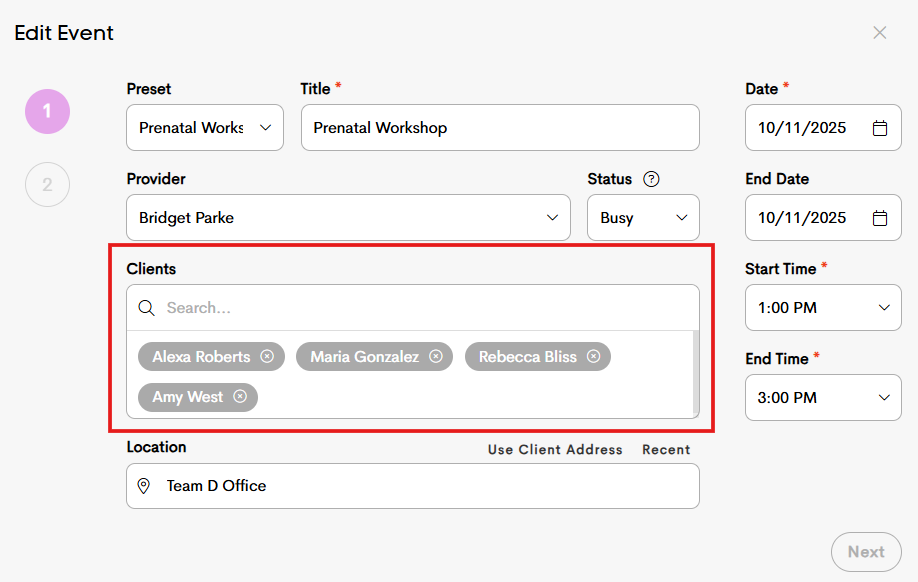 When creating an event, simply type in the names of the clients you’d like to add. Each client will see the event on their own schedule (with only their personal details), and it will also appear in their individual visit log. This makes it simple to manage group sessions—without the hassle of creating duplicate events.