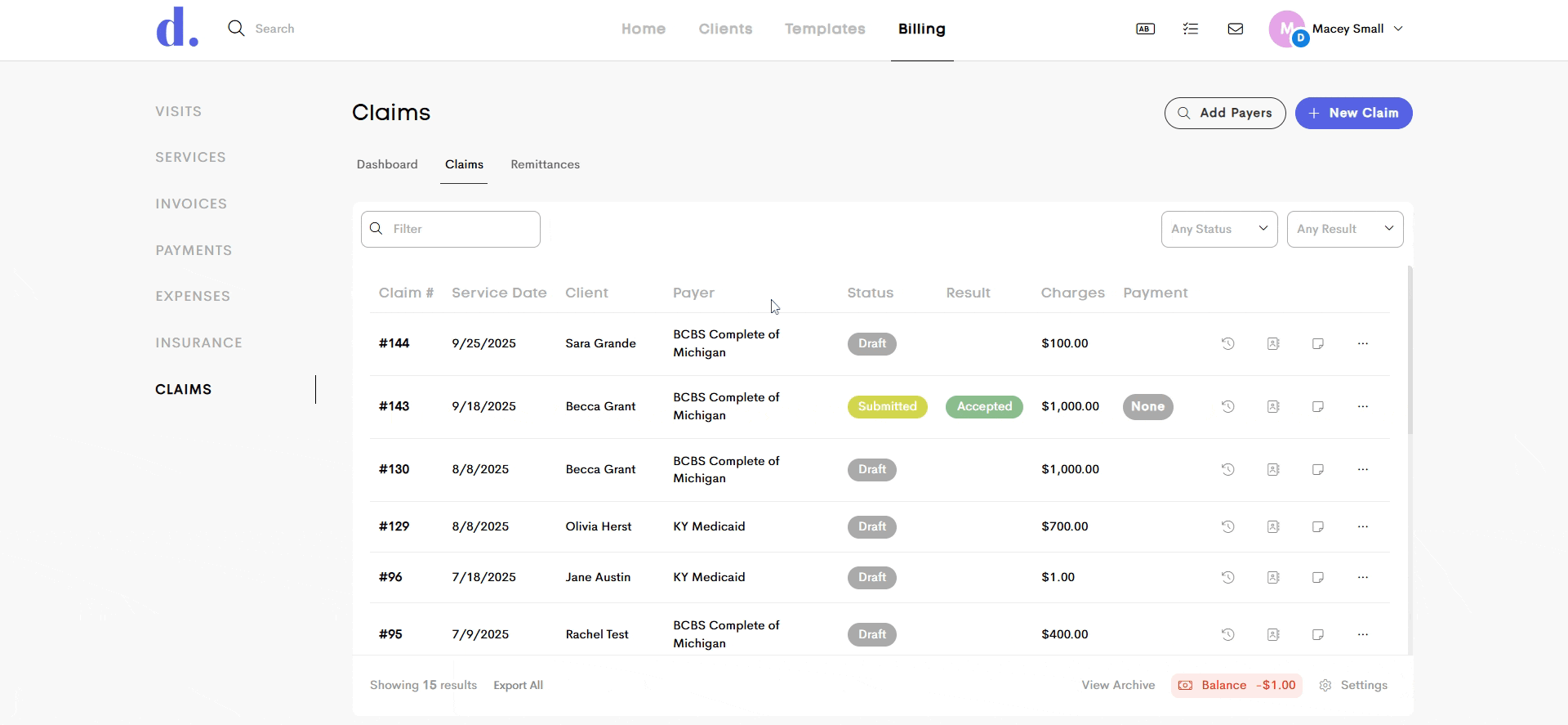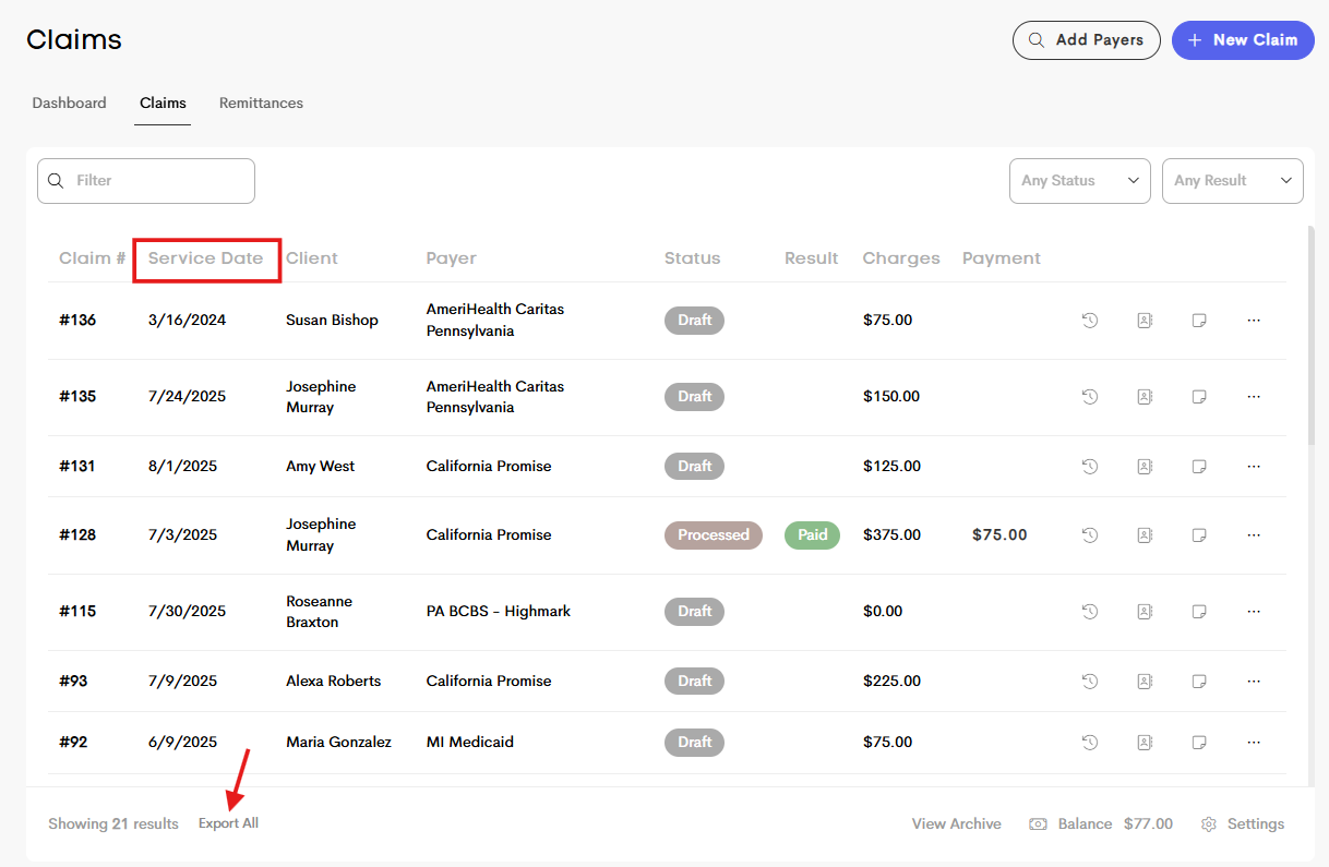 - Claim Date Specificity and Consistency: The previous “Date” column in the claims table has been updated to “Service Date” for greater clarity. This change removes ambiguity about what the date represents (e.g., created, submitted, or service date) and ensures that exported claim data is now more accurate and clearly labeled.