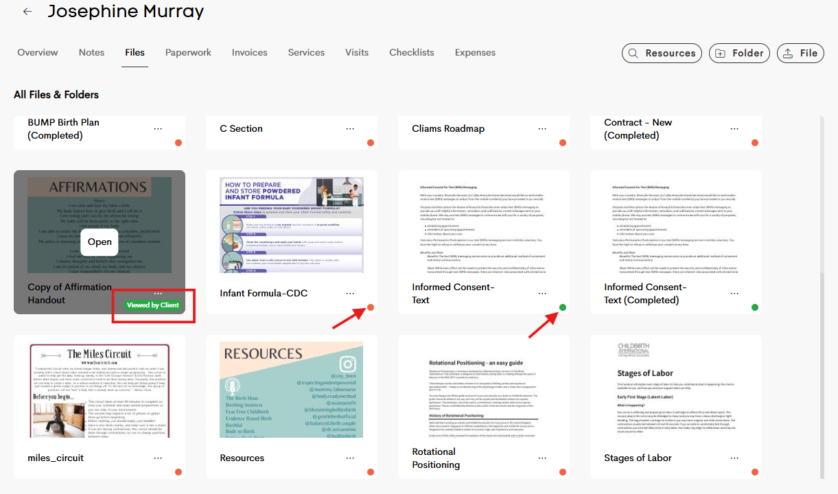 - Resource Accessed Indicator: You can now see whether a client has viewed a shared document or resource. This update makes it easier to track client engagement with shared materials. A view status marker appears at the bottom right of each file in the client’s journey: