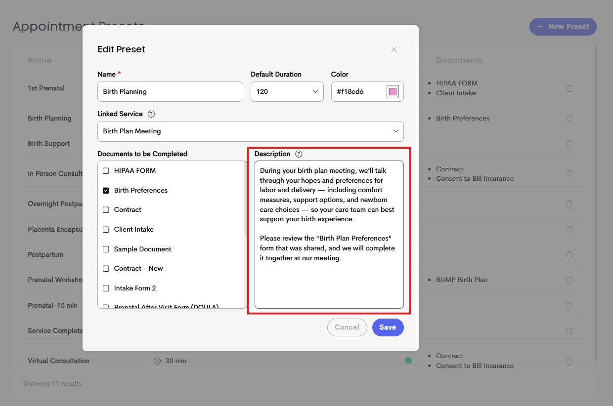 - Description on Appointment Templates: Preset appointment templates now include a dedicated description field. You can create or edit preset templates to add a custom description for that appointment type, which will automatically appear in the "description" of a visit scheduled using that preset. The description is visible to a client, and can include helpful information or details they may need to know surrounding that type of visit.