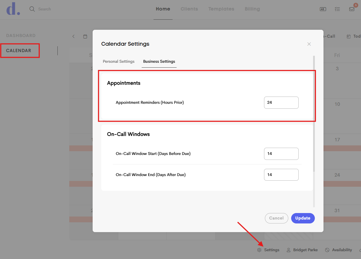 - Appointment Reminder Settings: Appointment reminders are now more flexible! Providers can customize when reminders are sent for upcoming events by setting their preferred notification timing. By default, these reminders go out 24 hours ahead of a scheduled visit, but that timing can now be adjusted in your Calendar Settings under Business, where you can choose the number of hours in advance to send reminders.