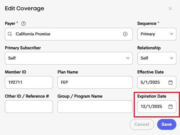 The expiration date for coverage (if any) can be set manually in the insurance record!