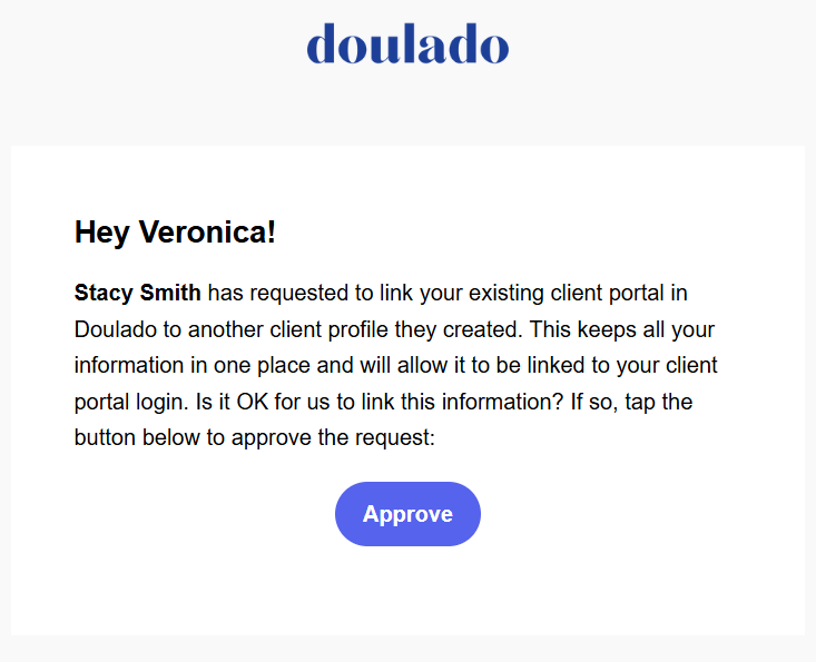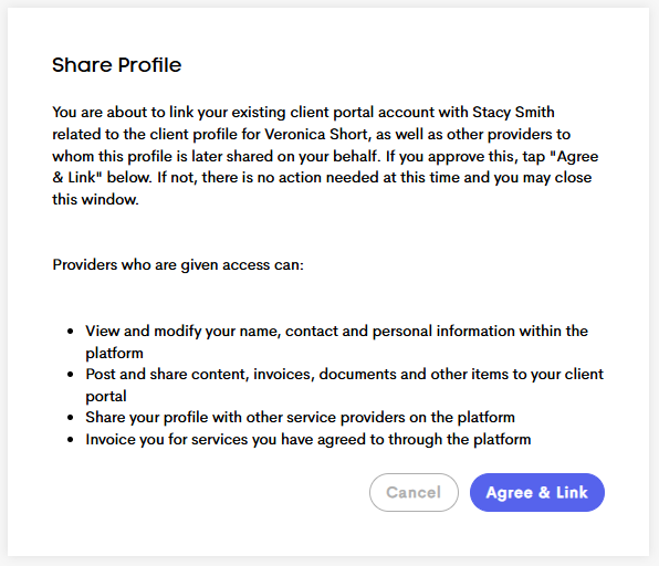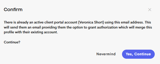 When enabling a client portal for an email that already has access, you’ll see a confirmation screen. The client will receive an email, like the example below, and an agreement explaining what merging their profiles will do.