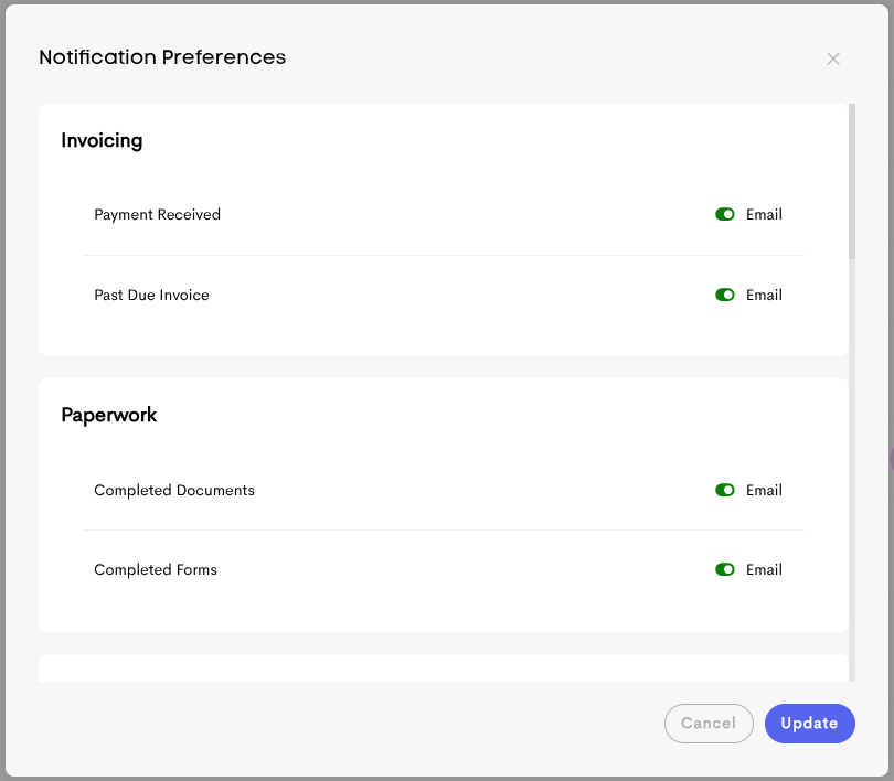 Customizing Your Notifications You can customize which types of events Doulado sends email notifications to you about. Access this setting using the Notifications option in Doulado's menu. When done, use the Update button to save your changes.