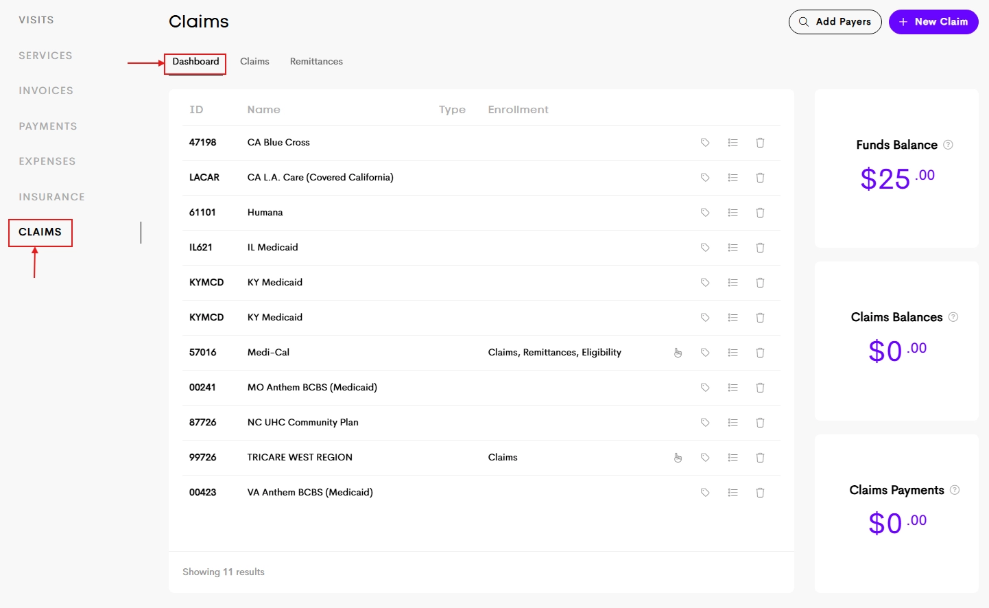 The Payer management interface is found under Billing → Claims → Dashboard. This area serves as the center for all insurance-related settings for the business.