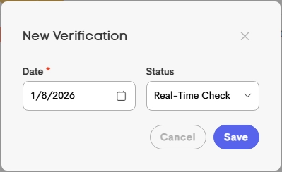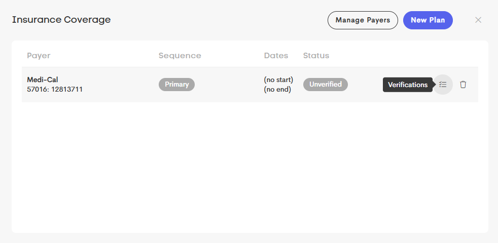 Navigate to the insurance record to verify (See: Insurance) and click Verifications to view the verification history or initiate a new verification.