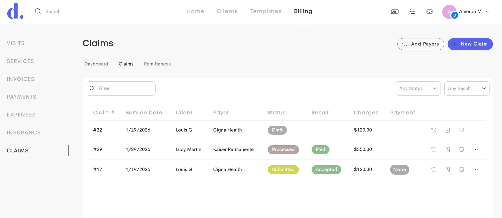 - Dashboard: Payers management and Claim statistics