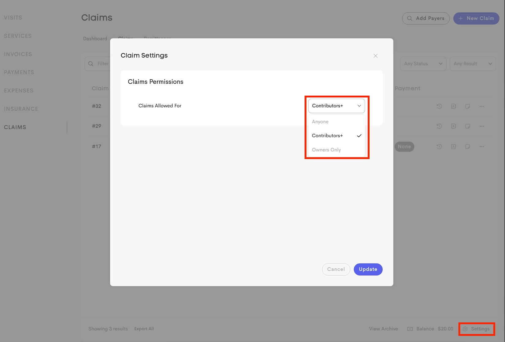 In a team environment, Business Owners can control which team members can access Claims via Claim Settings → Claim Permissions.
