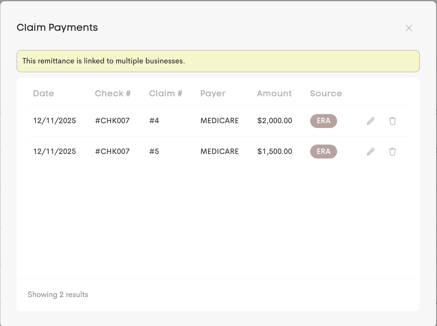 If a payment includes allocations for multiple separate businesses, a banner is shown indicating it is only showing the claim payments associated for the business.