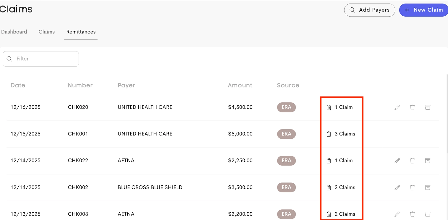 A single remittance can cover multiple claims from the same payer, regardless of the business or team in Doulado.