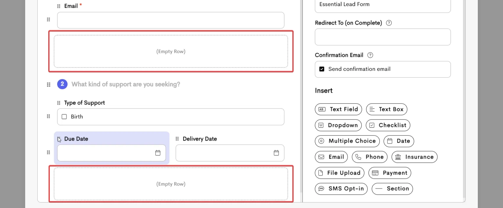 - A form field can be moved elsewhere in the existing row or dragged to another row.