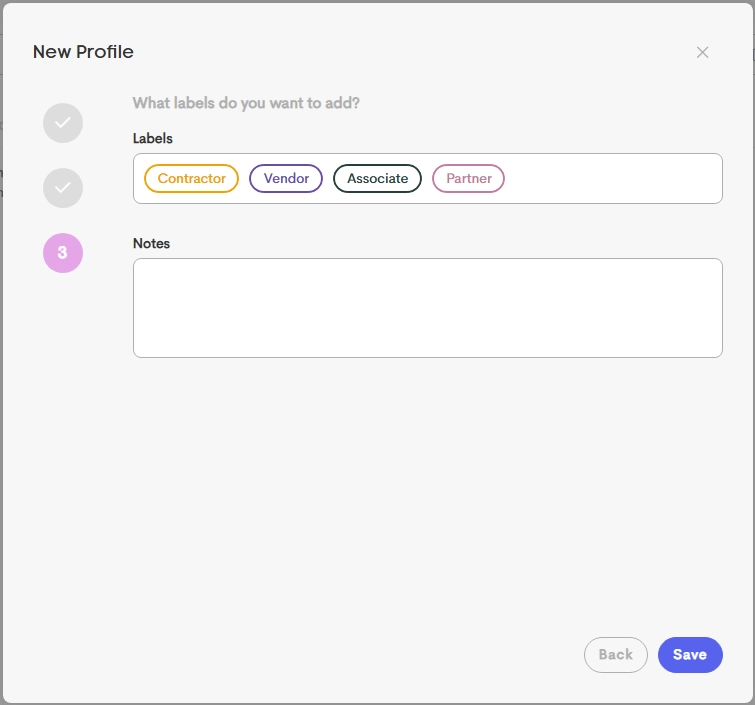 Labels for network journeys are managed in Templates → Labels. These labels are used to categorize profiles (e.g., "Contractor", "Vendor") and are required for Network Lead Forms.