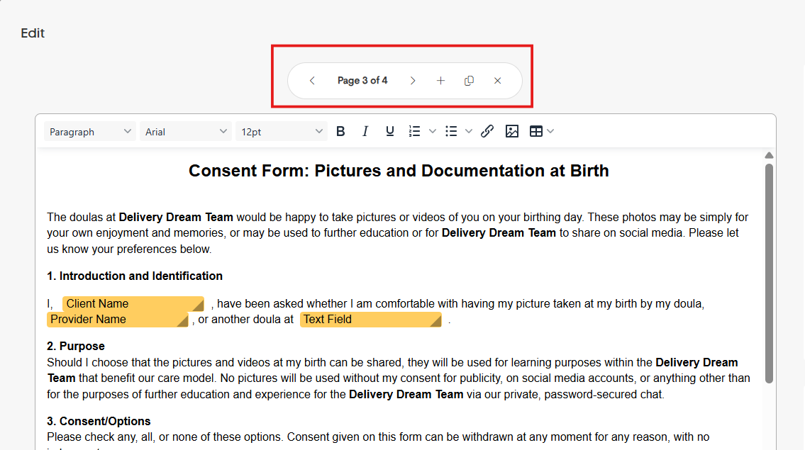 - Step-by-Step Experience: Documents can be broken into sections (like a contract, consent form, and waiver), and clients move through them step by step.