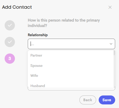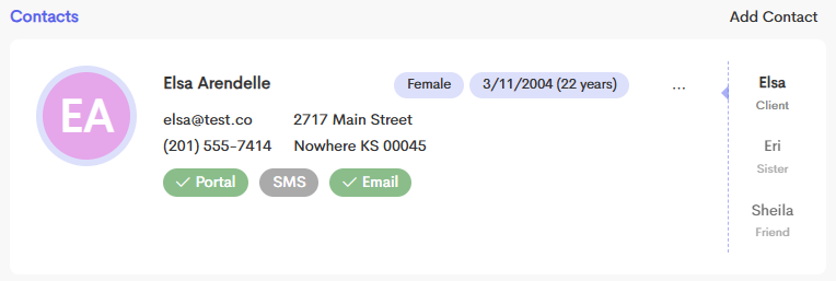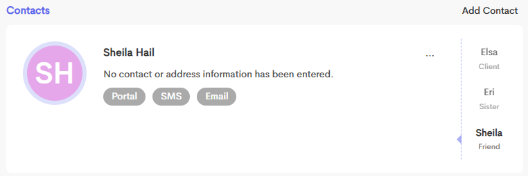 The relationship of each contact to the Primary Client can be specified (e.g., Partner, Parent, Spouse, Child, Friend, etc.). This provides context for who has access to the client's information.