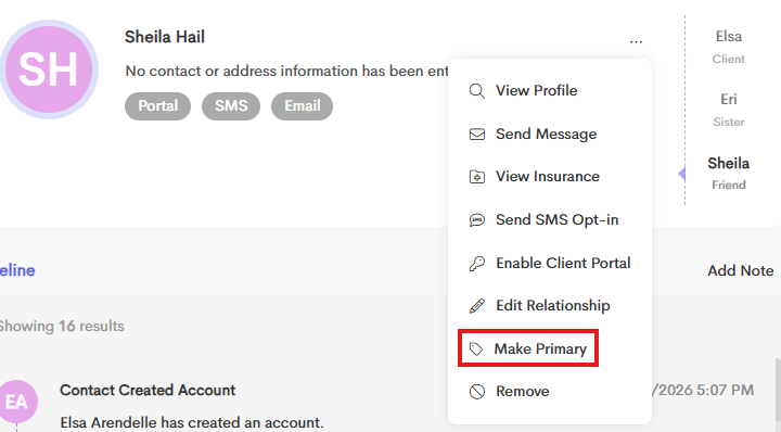 If there are multiple contacts on a client profile, the primary contact can be designated by selecting Make Primary on the contact intended to be set as the primary.