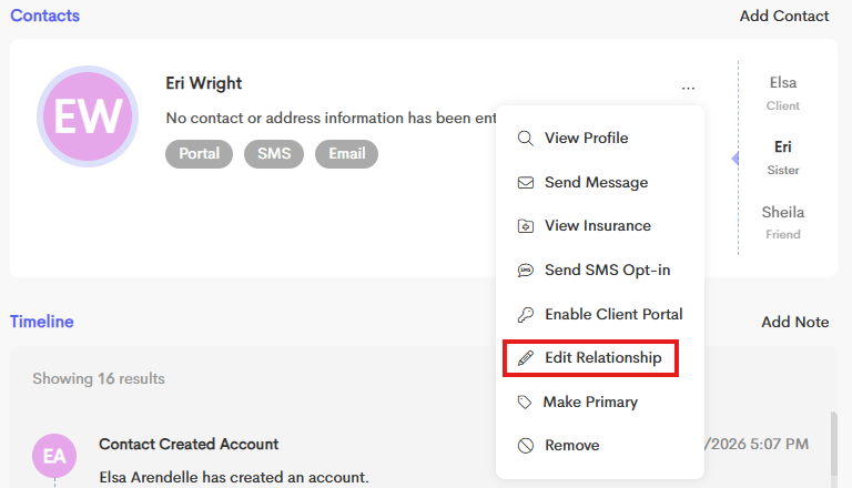 To edit a Contact Relationship for a Primary Client, go to the Contact Card of the contact and click on the Overflow menu.