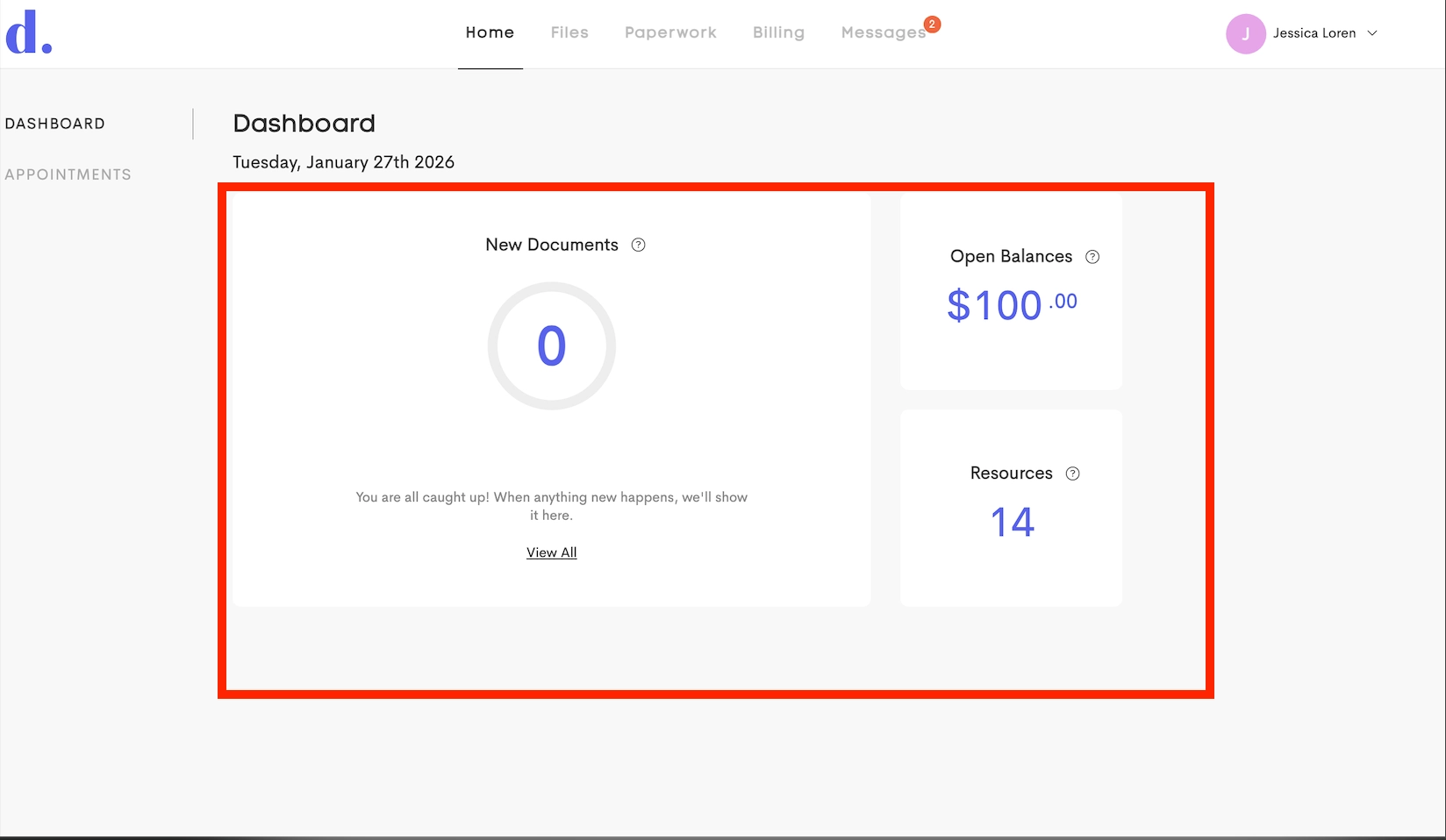 Dashboard: provides an "at-a-glance" view of quick actionable items and status updates. It summarizes key activity including pending documents, unpaid balances, and new resources shared by the provider.