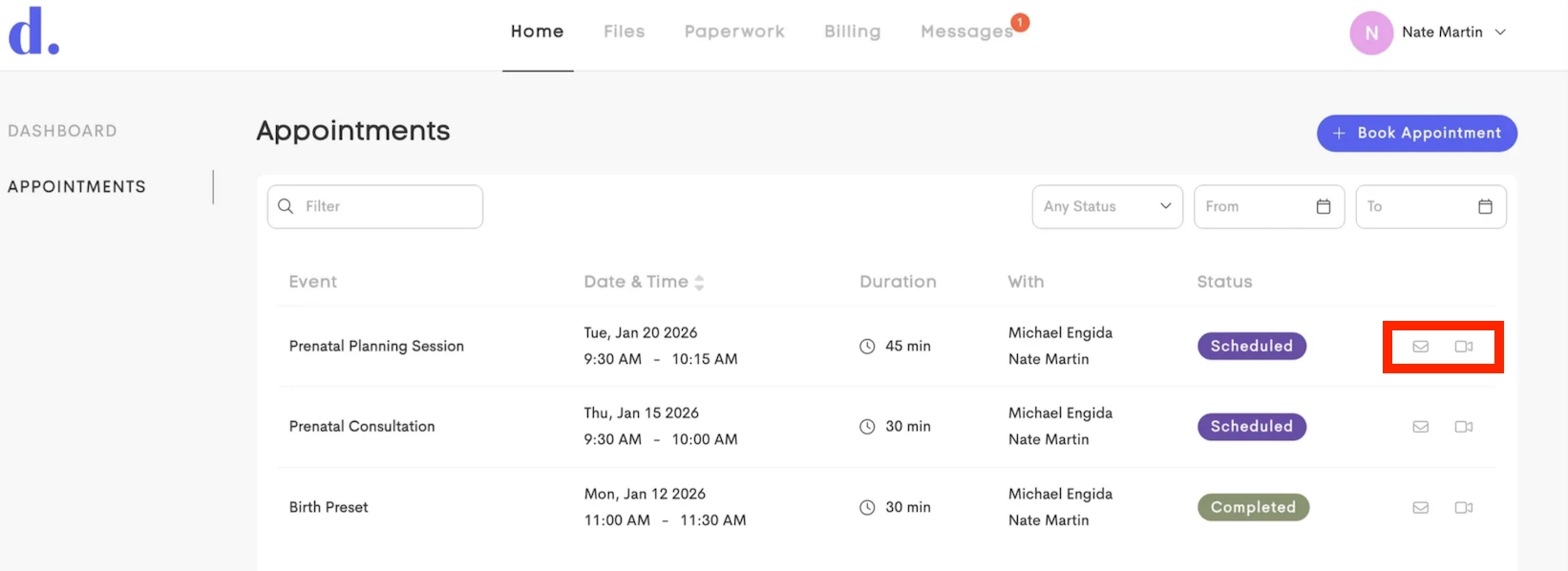 - For each appointment, clients can use the actions menu to Send Message to the provider or join a Video Room (if Telehealth is enabled for the owning business)