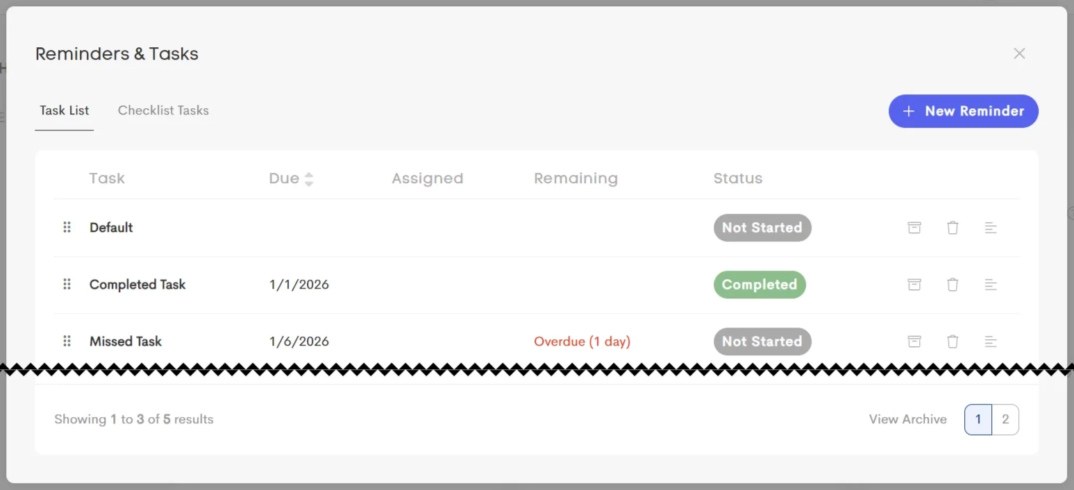 Completed reminders or tasks can be viewed in the Archives so that only pending and active ones are shown in the list. Click on the View Archive button on the bottom-right corner of the window.