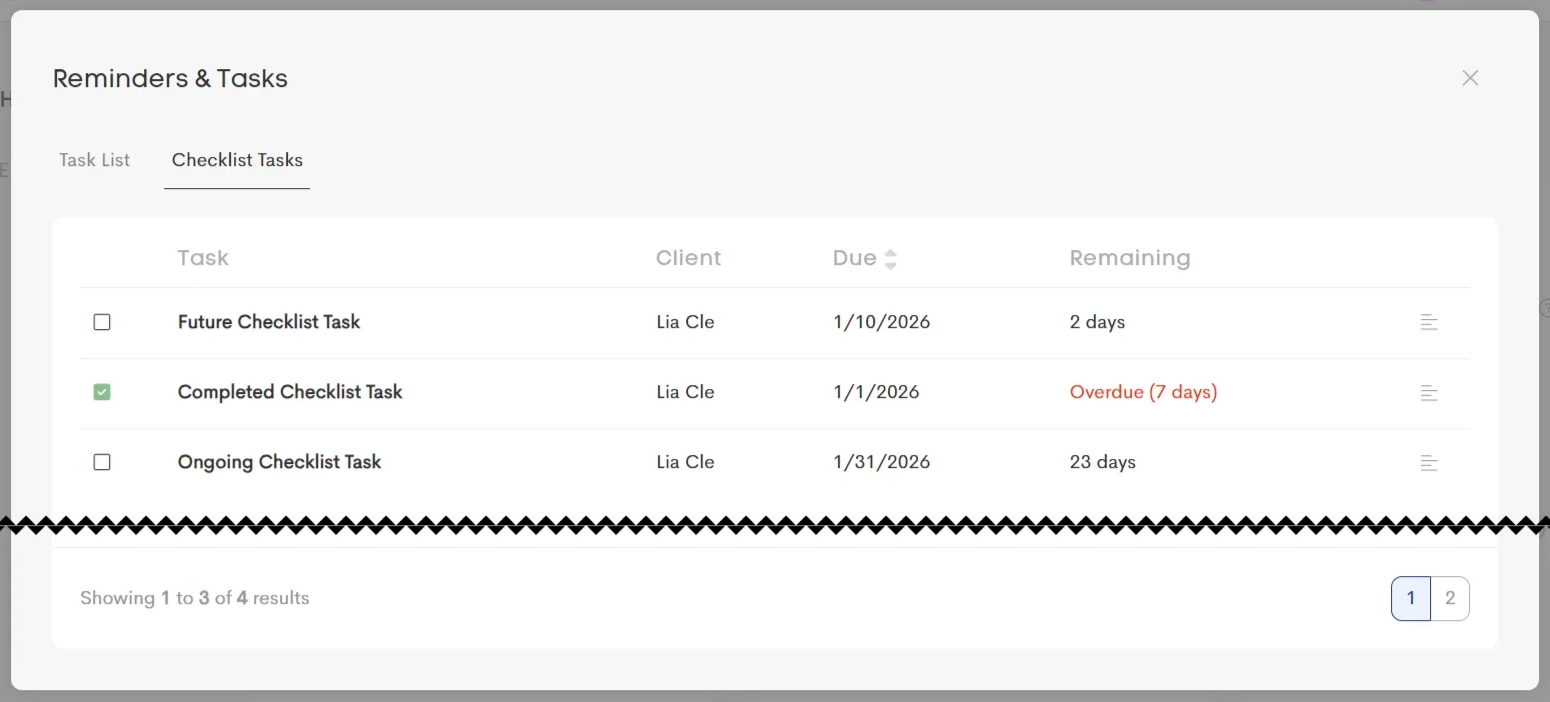 | Remaining | Days left before the due date, if set and the checklist item is not checked yet |