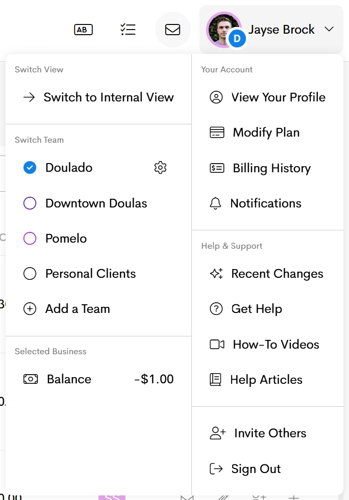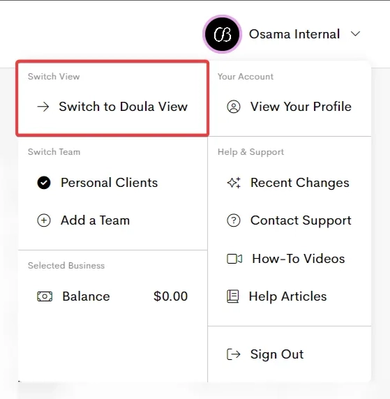 - Allows you user to switch between Internal, Doula and Client views, as needed.