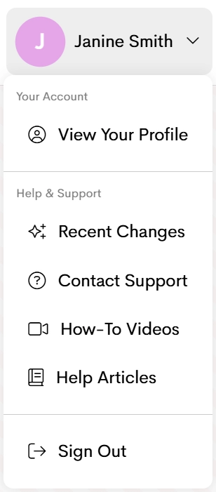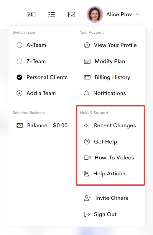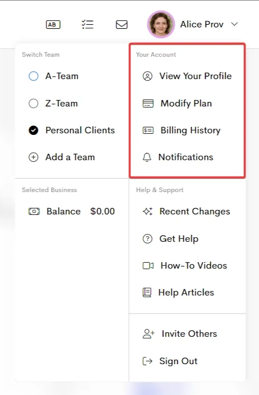 From here, you can switch between views, manage your teams, update your account, and access help and support, all in one place.
