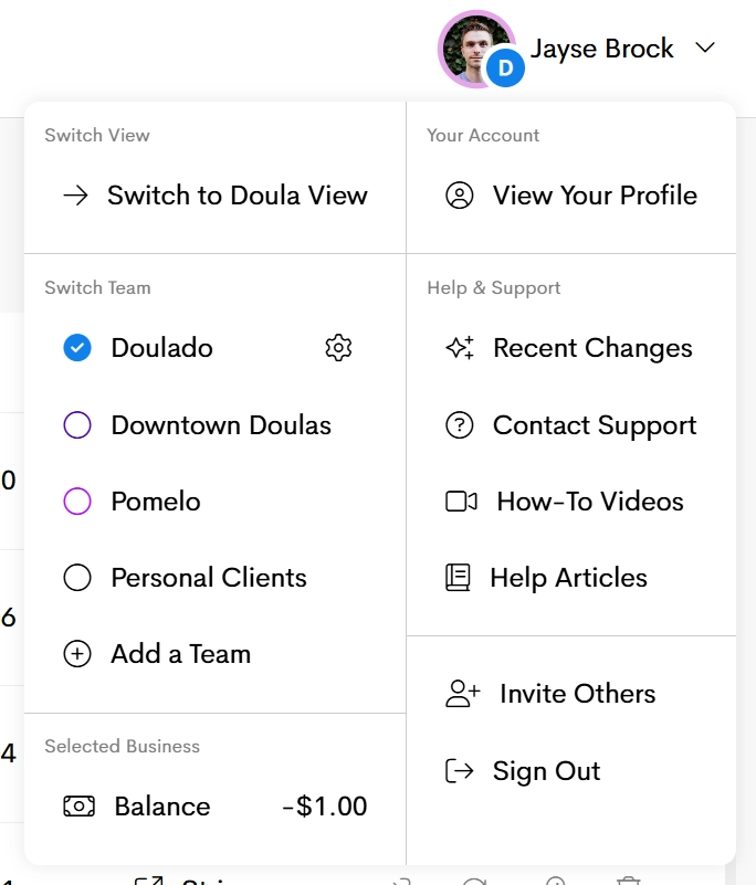 The User Menu provides quick access to your account, business settings, and key actions within Doulado.