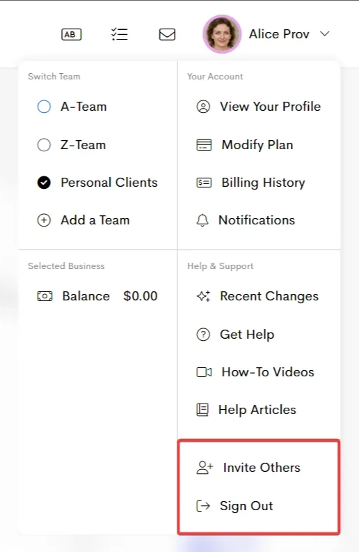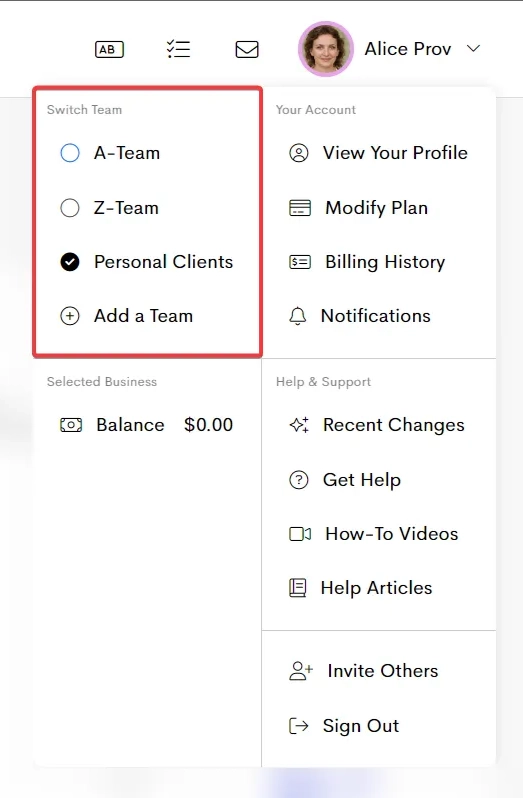 The Switch Team section allows you to select and manage the business you are currently working in. You can only have one business selected at a time.