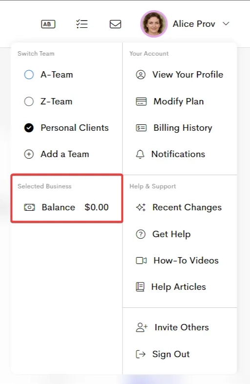 - Balance: Displays the current funds balance for the selected business