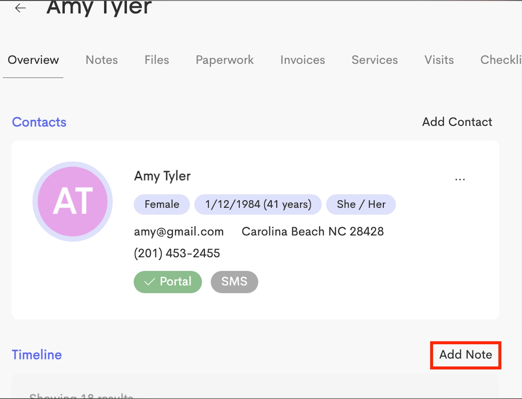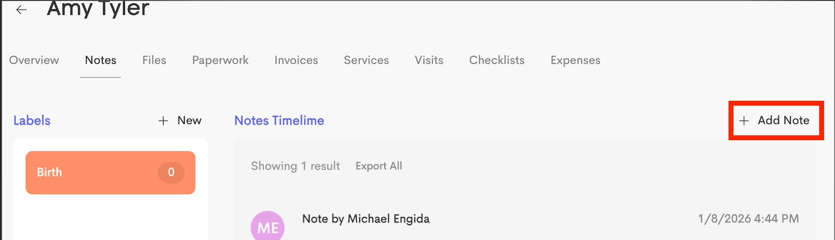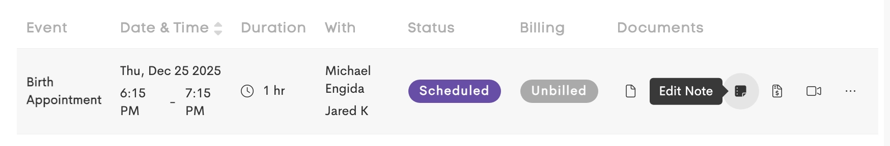 From Billing > Visits > Any Visit Row, click on the Add Note row action.