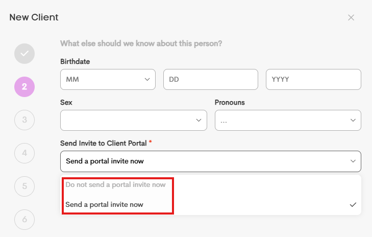 - On page 2, make sure the option Send a portal invite now is selected. You can change the default option that shows here in the settings at the bottom of your client list!