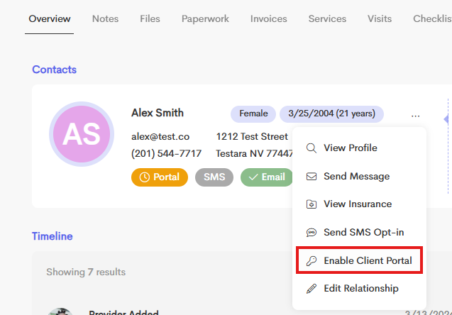 - If you click on Invite to Portal within the Client Profile (previous method), it will let you know that the client portal has been enabled from the client contact card menu in the client profile.