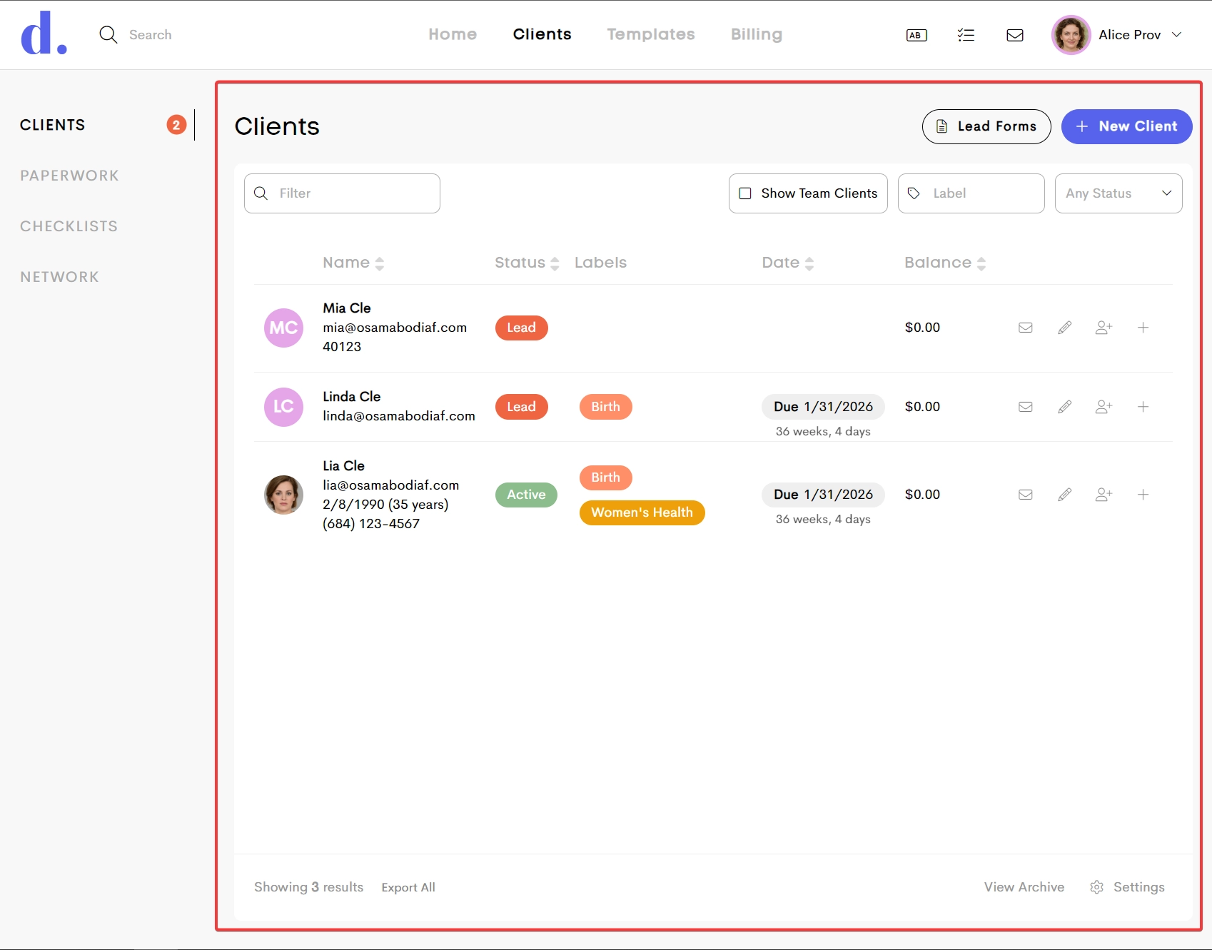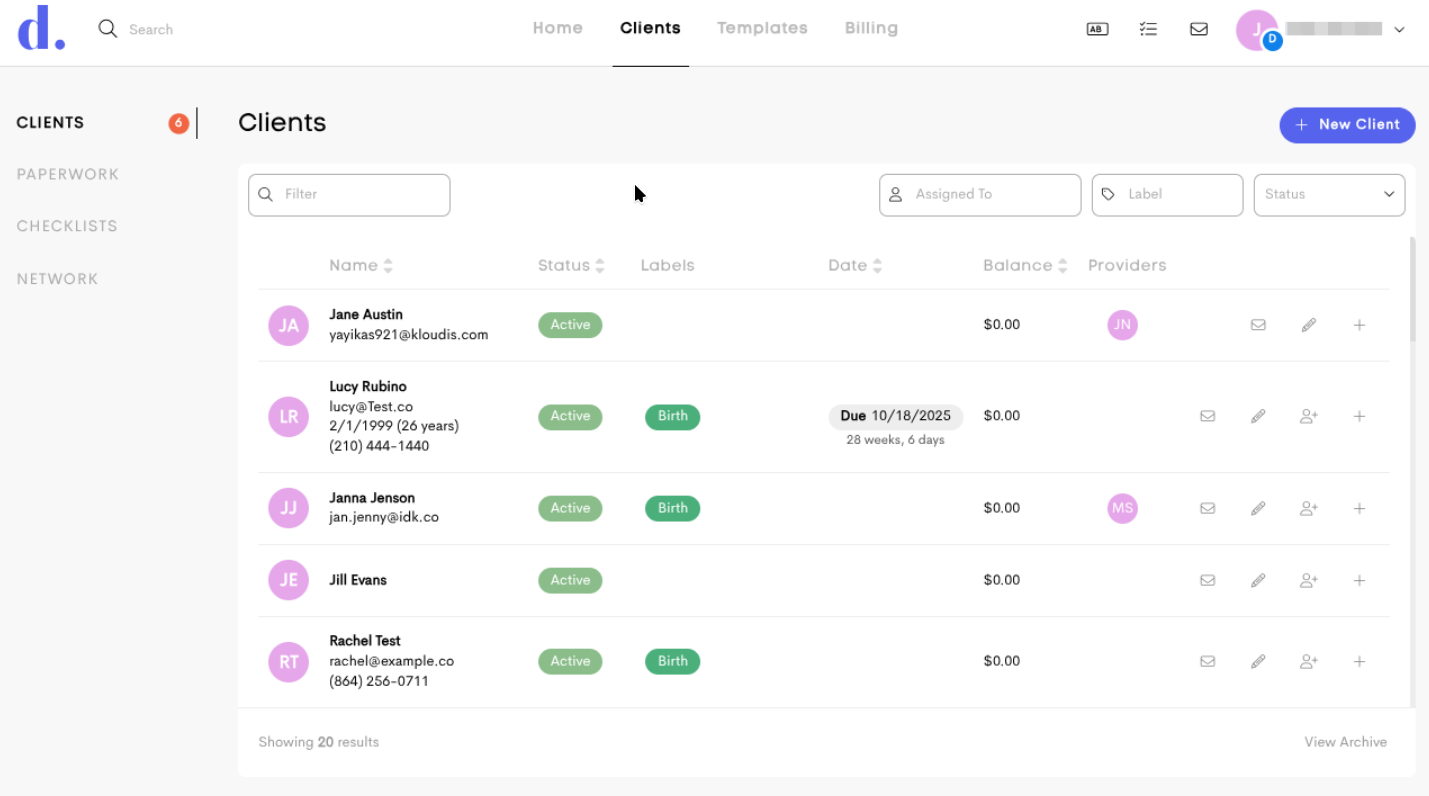 - User Icon: Assign a provider from the team, or assign yourself to the client