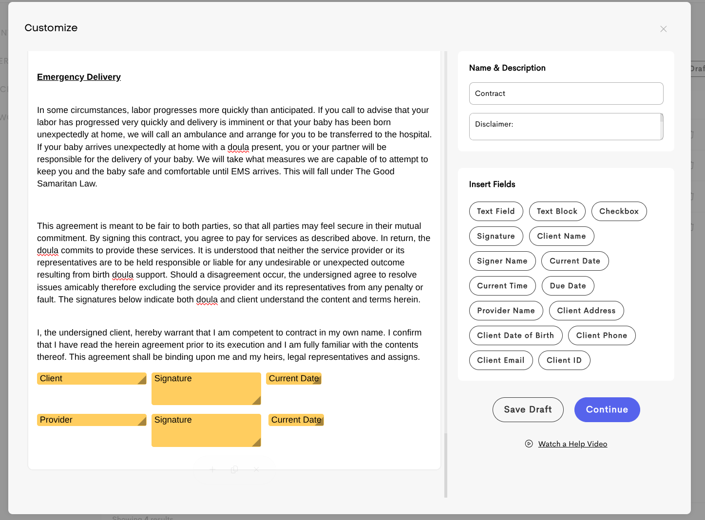 - Fill Document Fields is where you fill out any fields that you need to, as the doula. Anything that you fill out, will not be fillable by the client. Anything that is not filled out, and required, will need to be filled out by the client. Once you are done with your part, you can click continue.