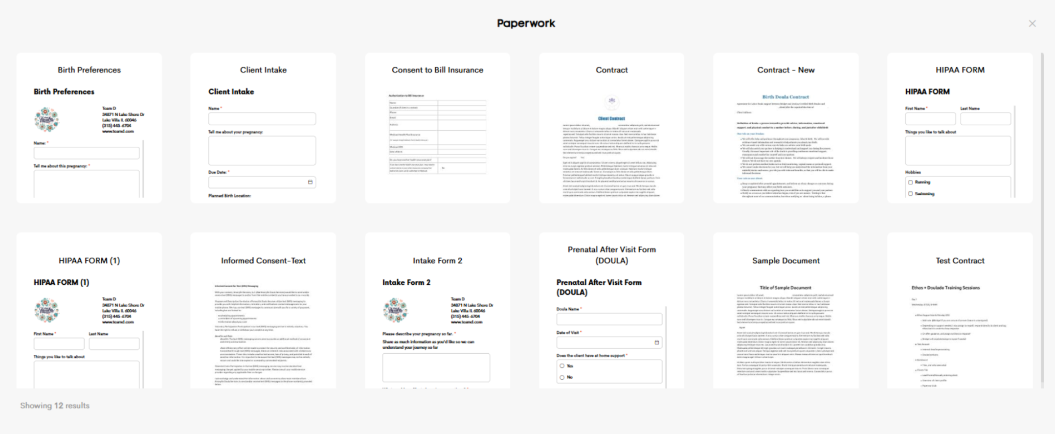 A new paperwork can be created at any time, based one of your team's document or form templates, to be filled and signed electronically through Doulado. The progress made on completing a paperwork can be a collaborative effort, completed by any combination of the creator, other providers and the client.