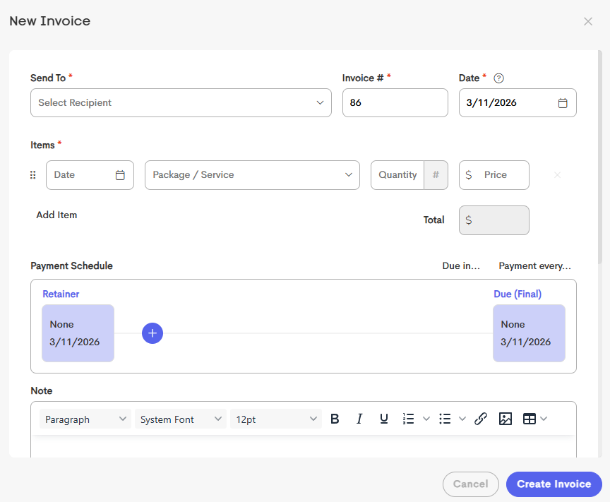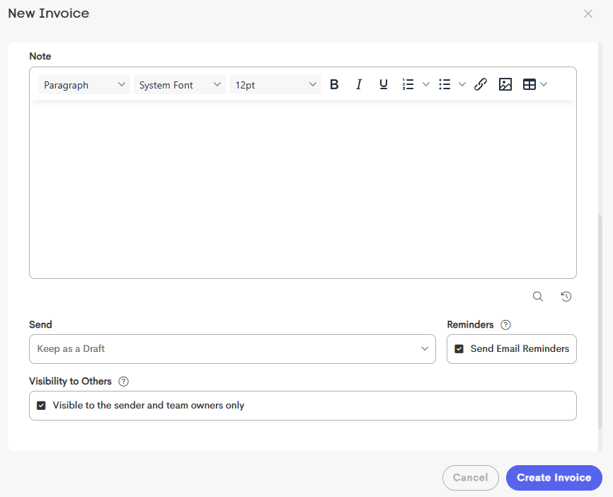 Add an optional note which will be visible on the invoice. You can select from a previously created note template to more easily add recurring notes.