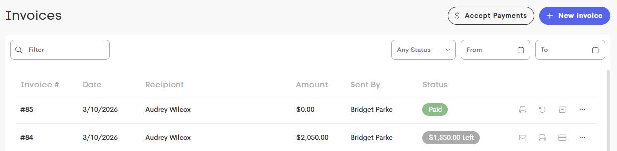 Invoices can be paid by way of a single payment on the due date, or by way of multiple installments with customizable amounts and due dates.